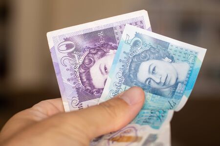 Persons hand giving the Currency of the England in the United Kingdom - One purple twenty pound and blue five pound note spread out on a brown background. Money exchange.