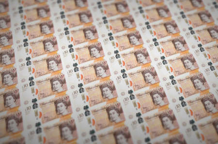 10 British pounds bills printed in illegal money production conveyor. Collage of many fake bills. Concept of counterfeitters mass work