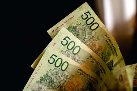A person holding pesos bills in close-up of the money of the argetine currency, the Argentine peso, isolated on dark background. Photo for representation of economy and finance.