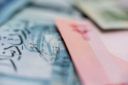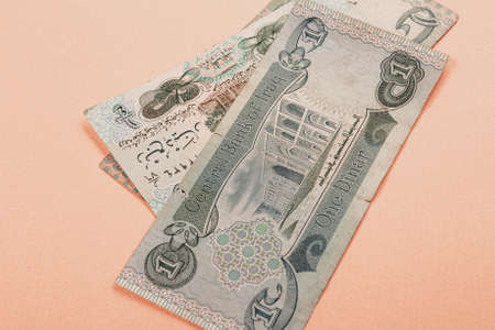 A close up view of United Arab Emirates currency, with white background, UAE Dirhams