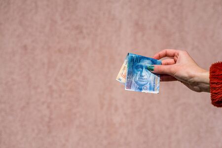 Hand holding showing euro money and giving or receiving money like tips, salary. 100 swiss franc banknotes CHF currency isolated. Concept of rich business people, saving or spending money.