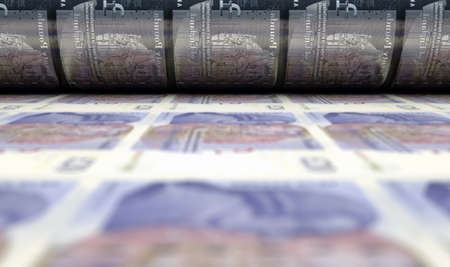 A concept image showing a sheet of british pound notes going through a roller in its final phase of a print run - 3D render