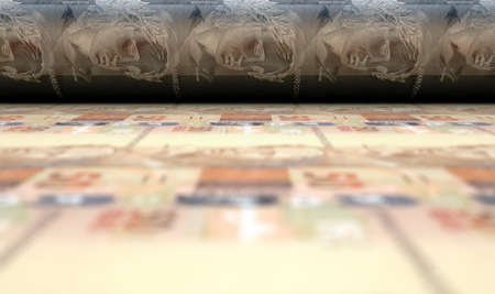 A concept image showing a sheet of brazilain real notes going through a roller in its final phase of a print run - 3D render