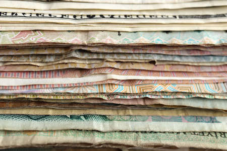 A neat stack of colorful banknotes is arranged on top of each other, creating a vibrant display of various denominations