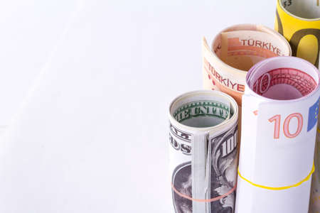Different colourful banknotes from various countries on rolls to be used for illustrating subjects as business, banking, media, etc.