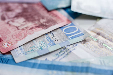 Moscow, Russia, February 2020: A pile of ten, twenty and fifty pound notes.