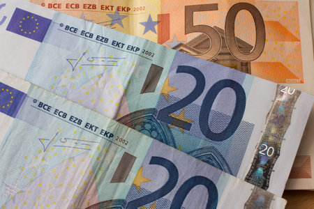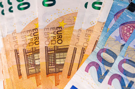 Macro view of twenty euro notes placed on fifty euro banknotes, symbol of European currency, savings, and financial transactions.