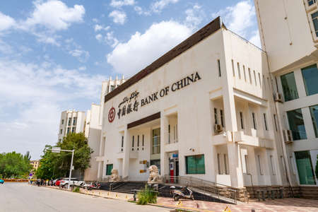 Kashgar Bank of China Building Side View at People's Park Square on a Sunny Blue Sky Day