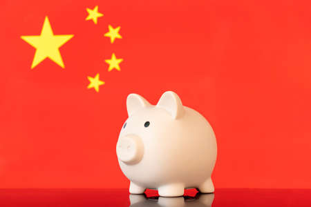 Waving red national flag of China against one chinese yuan banknote background. Finance concept
