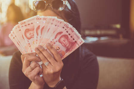 Woman holding chinese yuan banknotes. Concept of chinese currency, economy, finance, investment, growth, wealth, global business.