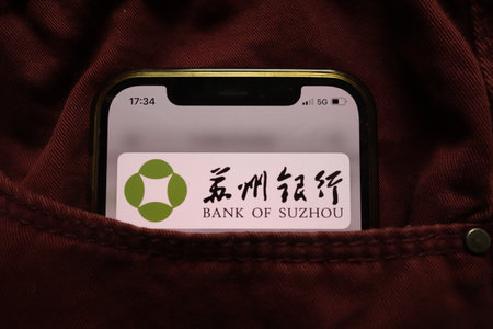KONSKIE, POLAND - September 15, 2021: Bank of Suzhou displayed on mobile phone hidden in jeans pocket