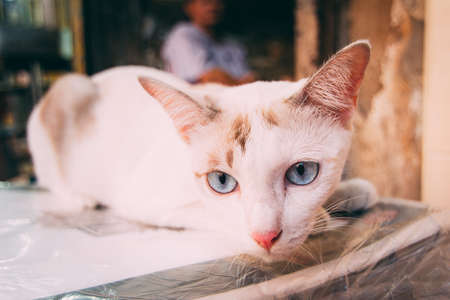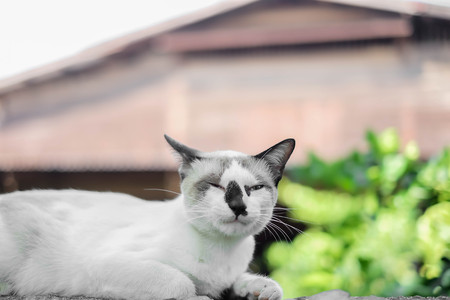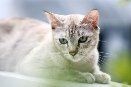Portrait of Siamese cat resting on the floor in sunny day. It is close up photo. Cat has cute and beautiful blue eyes.