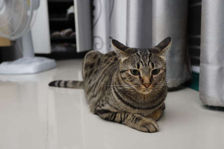 Beautiful gray cat lying on the floor. The concept of pets. Funny tabby cat at home.