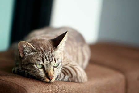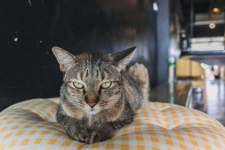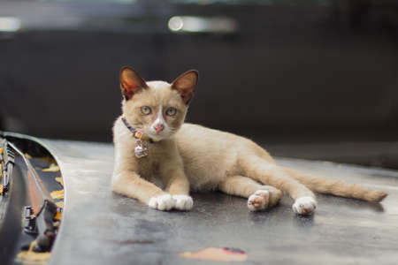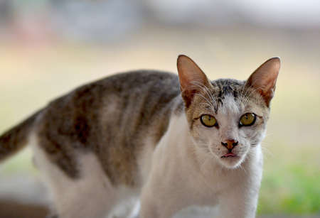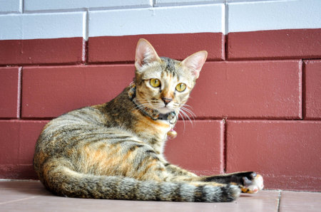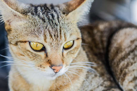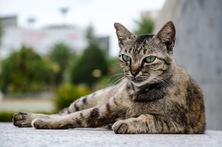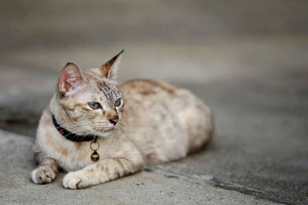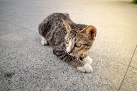 Cute cat lying on the cement floor Looking for something. With Cat yellow eyes and a bushy mustache. Close up.