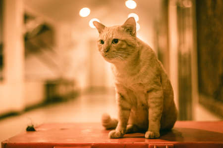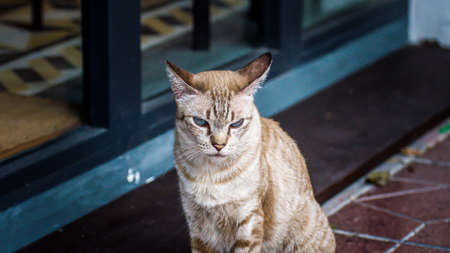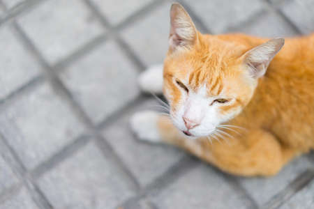 Close up portrait orange cat is sit on a concrete floor outside the house.