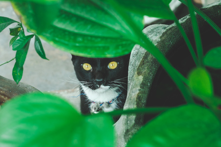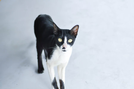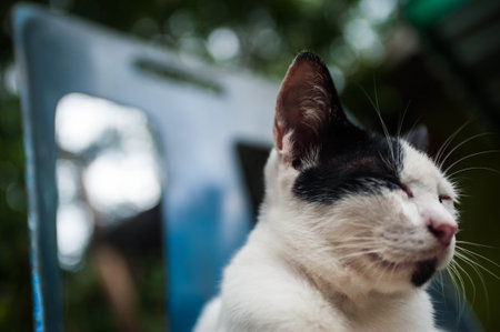 Black and white cat looking aside. Young Greek domestic cat in her backyard.