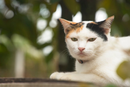 Three color chubby cat lying down on the rustic timber floor outdoor