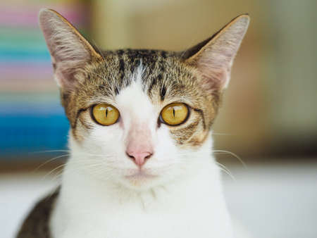 Curious cat looks into the camera. Pet in bright daylight. Kitten with colored fur and a cute muzzle. Domestic animals theme. Close up and copy space.