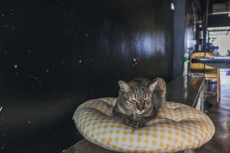 Cranky cat sleeping on the sidewalk in the morning in vintage tone.