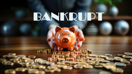 Hands holding a piggy bank with scattered coins on a table, symbolizing financial crisis and bankruptcy.