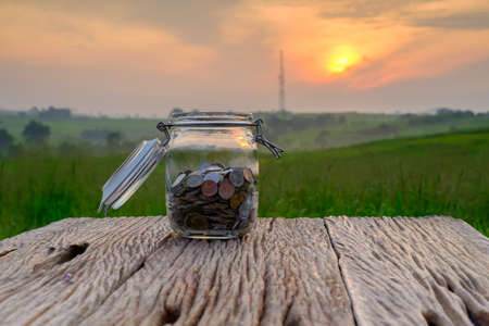 Coins inside a glass jar savings placed on a wooden table represent accumulating wealth and achieving financial goals