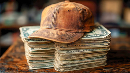 A weathered baseball cap rests atop massive stacks of old dollar bills, evoking themes of hidden fortune or old wealth.