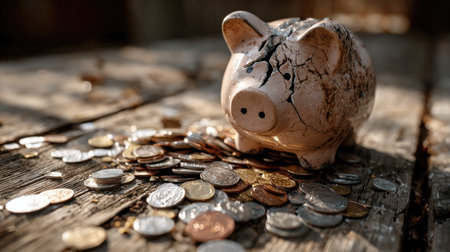 A weathered piggy bank, cracked and broken, rests amidst scattered coins on a rustic wooden surface. This image represents savings, wealth, and financial planning.