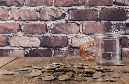 Poverty concept image with a few small coins remaining in a glass savings jar on wooden table