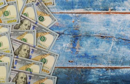100 American dollars banknotes bills on blue old wooden background Money, business concept.