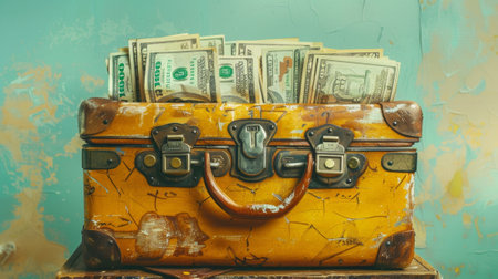 Suitcase full of money. Minimal abstract business and wealth concept. Copy space.