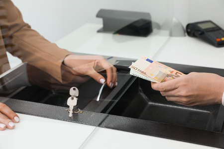 Man giving money to cashier in bank, closeup. Currency exchange