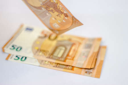 Fifty euro banknotes falling down isolated on white background