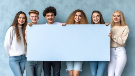 Global communications Group of happy young people holding empty speech bubbles and looking at camera while standing against grey background : Generative AI