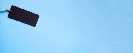 Banner with one blank black paper price tags on string. Light blue background. Copy space, top view.