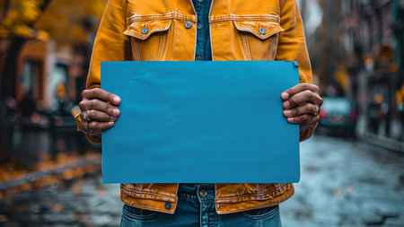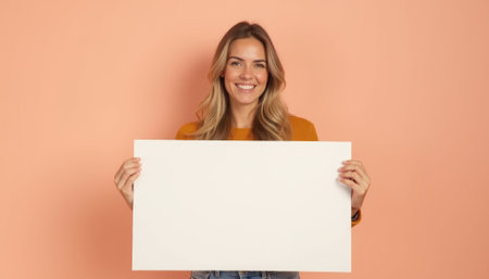A woman smiles as she holds a blank cardboard sign against a peach-colored background, reflecting positivity and space for communication. The image suggests freedom to express a message.