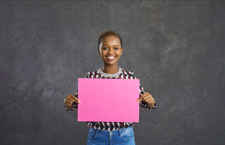 Happy smiling black woman holding blank pink banner standing against grey background. Portrait of cheerful beautiful short haired young African lady showing clean mockup sign with creative copyspace