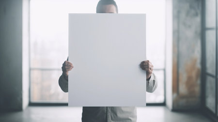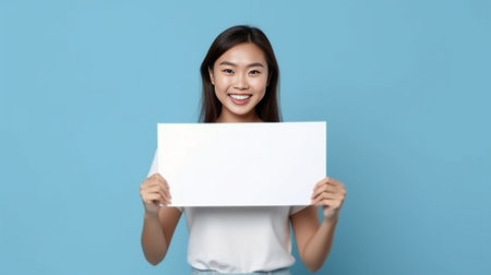fictional adult holding blank sheet smiling softly with eyes closed pastel gradient background and serene tone