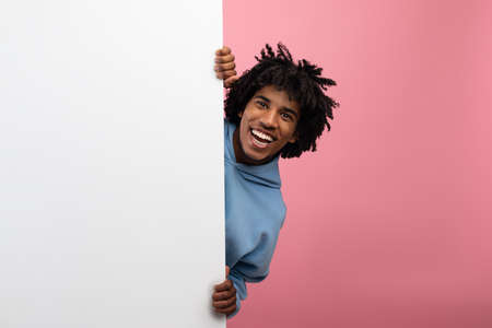 Attractive African American teenager hiding behind blank poster with copy space on pink studio background, mockup