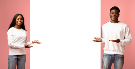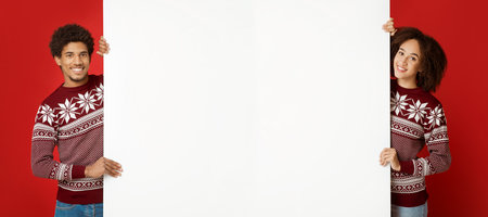 Smiling pretty young african american couple friends in same sweaters with pattern hold big white empty billboard