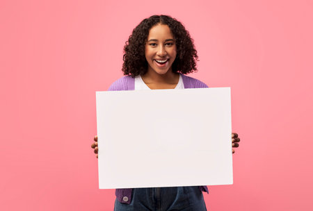 Happy Millennial Woman Showcasing Empty Poster in Pink Studio Background