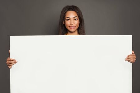 Advertisement concept. Teen smiling girl with blank presentation board. Young female student showing banner sign billboard copy space for text