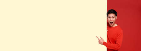Happy handsome asian man in red casual attire with hand pointing blank announcement banner in red background.