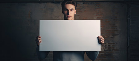Close up of young attractive man horizontally holding blank canvas at the street. Man and canvas are on foreground and focus, background is blurred.