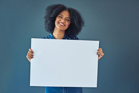 Now heres something thatll make you smile. Studio shot of a young woman holding up a blank placard against a gray background.