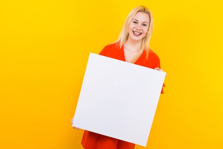 Portrait of attractive happy blonde woman in red dress isolated on yellow background holding emty blank board your text here concept.