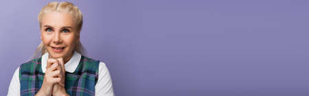 Blonde student with clenched hands smiling at camera isolated on purple, banner