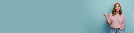 Young happy woman smiling and pointing finger aside isolated over blue background
