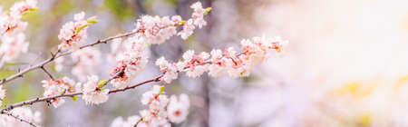 Beautiful panoramic spring scenery with cherry blossom and bokeh background