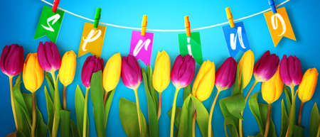 Word Spring made from colorful wooden letters on tender floral background