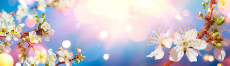 Abstract Spring - White Blossoming Branch With Sunlight And Blue Sky